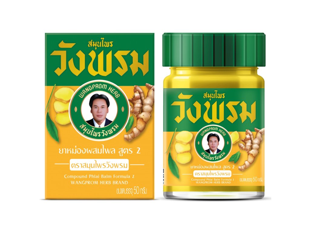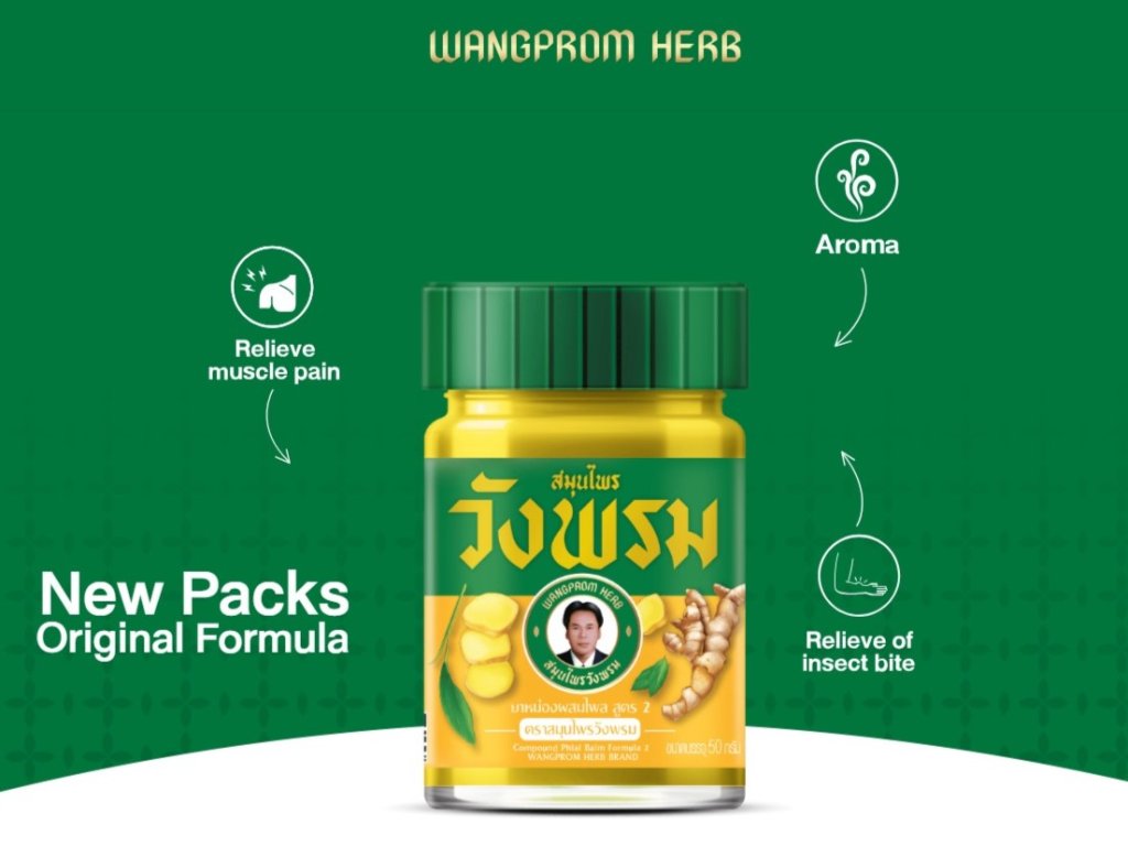 bylinný balzám, thajský bylinný balzám, Wangprom Herb, Wangprom balzám, tradiční masážní balzám, aromaterapie, wellness produkty, Nakhon Pathom, másážní přípravek.
