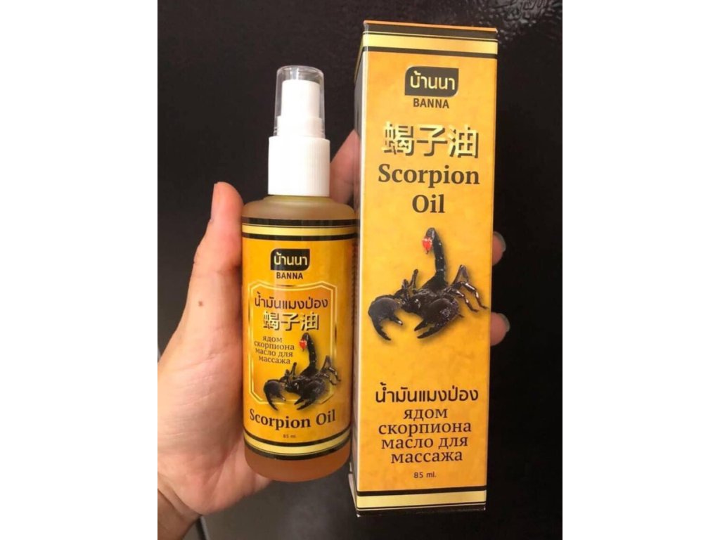 thajský masážní olej, Banna scorpion oil, hřejivý olej, masáž těla, thajský wellness, aromatický olej, masáž po sportu, relaxační rituál, olej na masáž